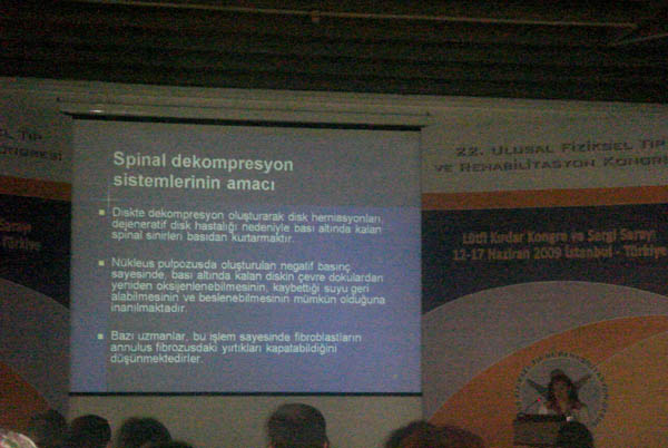 Ulusal kongre kapsamında yer alan sunumlarda ‘FİZİK TEDAVİDE YENİ TEDAVİ SEÇENEKLERİ ’ana başlığı, ‘SPİNAL DEKOMPRESYON’alt başlığıyla ;sayın Fikret Tüzün ve sayın Zuhal Altay oturum başkanlığında, sayın Vural Kavuncu’nun katkılarıyla konuşmacı sayın Özlem Solak tarafından cihazımızla ilgili geniş bir prezantasyon yapılmıştır.